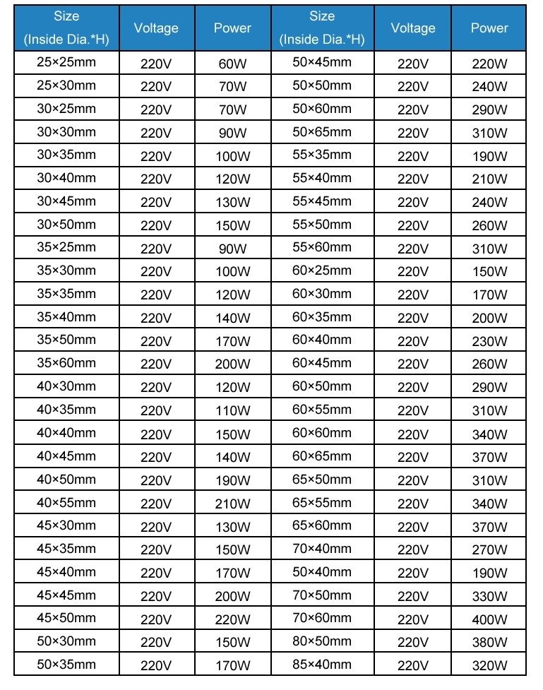 Sản phẩm điện trở vòng nhiệt, vòng sứ, điện trở vòng nhiệt của chúng tôi sử dụng tấm mica chịu nhiệt độ cao có độ dày 0.6mm và bao bọc bên ngoài là thép không gỉ SUSx430, SUS201, SUS304 ...có thể tùy chỉnh.